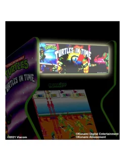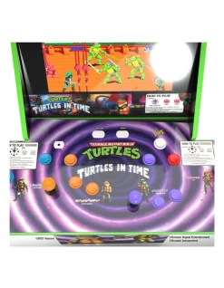 More features of this TMNT Turtles In Time arcade cabinet by Arcade1UP include 4-player gameplay with 4 sets of controls, retro Turtles in Time cabinet artwork, both games being playable online over WiFi, a custom TMNT riser for added height, light-up marquee & deck protector, moulded coin-door replica, realistic controls and matching Turtles in Time stool.