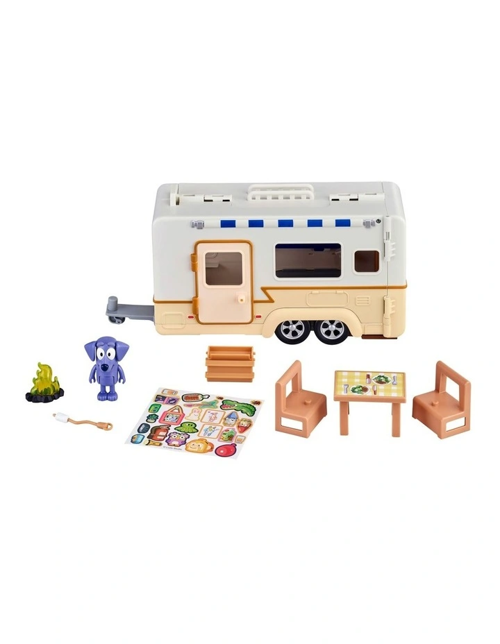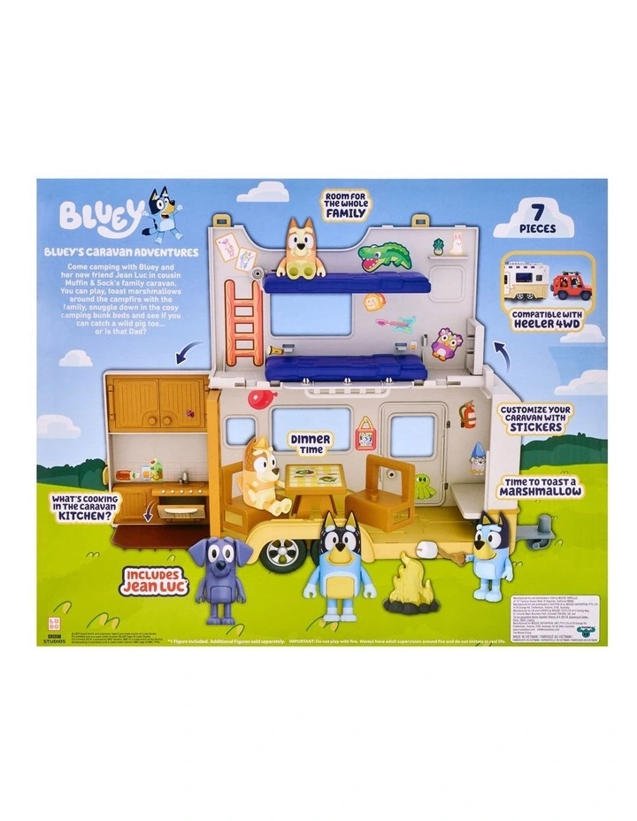 Go on a caravan adventure with Bluey’s family and friends. Bluey’s Caravan Adventures Playset is loaded with features and things to do as you take a caravan vacation! There’s room for the whole family in this transforming playset. Fold up the roof to reveal a second story and cozy bunk beds. Flip out the back of the van to open up the kitchen. What’s cooking in the oven? Open it up and see! Sit your figures in the chairs around the table and get ready for dinner or toast a marshmallow over the campfire. Customize the caravan with the fun stickers supplied.
