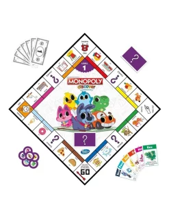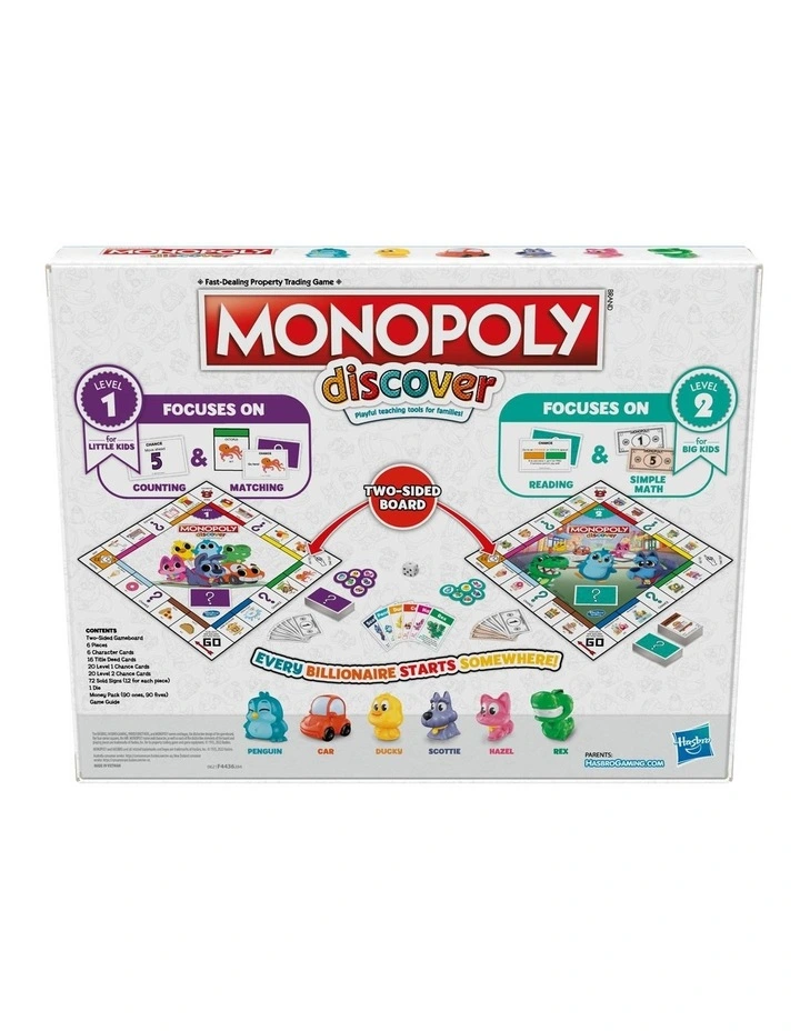 The Monopoly Discover board game offers fun teaching tools for families. It features a double-sided gameboard with 2 levels of play, so you can decide which level is right for the family! One side focuses on counting and matching, recommended for kids ages 4-5. Flip the board over for more advanced play, focusing on reading and simple math, recommended for kids ages 6 and up.