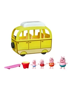 Preschoolers and Peppa Pig fans ages 3 and up will be delighted with the Peppas Beach Campervan vehicle toy. Inspired by the familys campervan from entertainment, it comes with all 4 Pig family figures Peppa, Mummy Pig, Daddy Pig, and little brother George. The roof (with an attached storage unit for the familys surfboard!) opens to reveal 2 removable bench seats. The back door folds down to reveal a grill. Rolling wheels let kids push the campervan all around, and imagine exciting beach adventures for Peppa and her family.Β Β Includes vehicle, 4 figures, and 5 accessories.