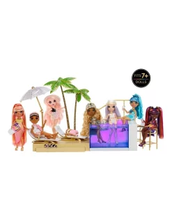 RAINBOW HIGH INSPIRES CREATIVITY & IMAGINATIVE PLAY: The beach is our playground at Pacific Coast, the most elite fine arts high school on the west coast. Here the days are sunny and the classes are poolside. Bring your Rainbow High Pacific Coast Fashion Dolls to the coolest pool playset that sparks imagination and storytelling fun. They can lounge by the pool, relax at the juice bar, or take a dip in the 7-in-1 color changing pool. Easy to operate- just fill it up with water and press the button to select your pool color (clear, red, orange, yellow, green, blue, or purple).