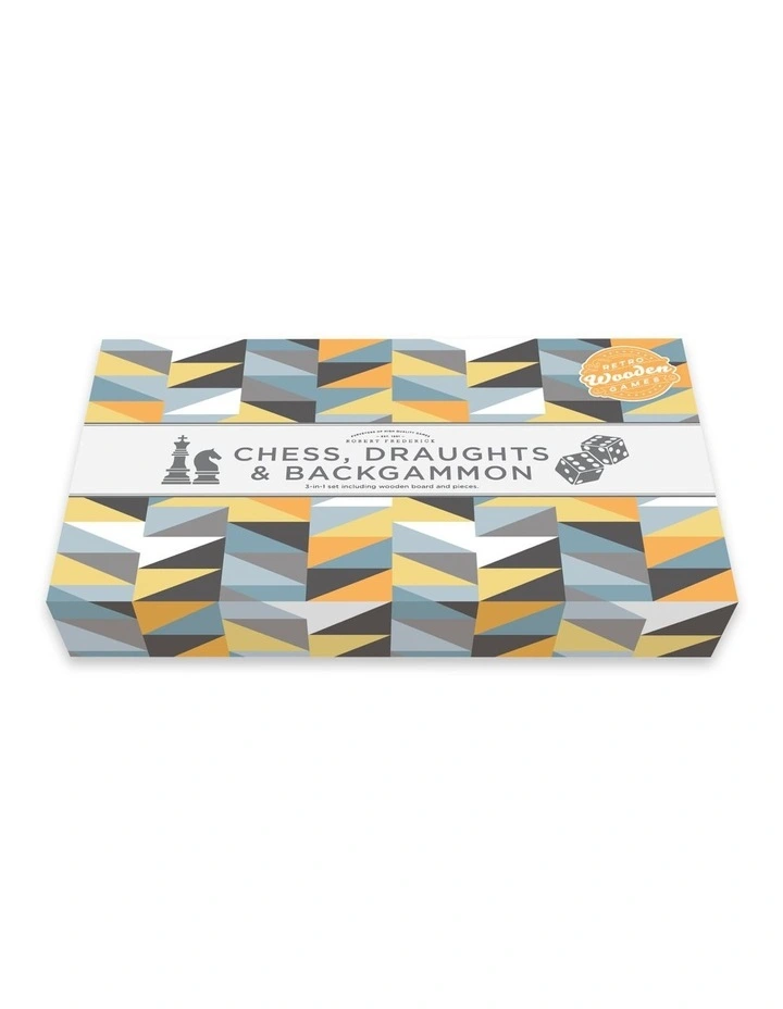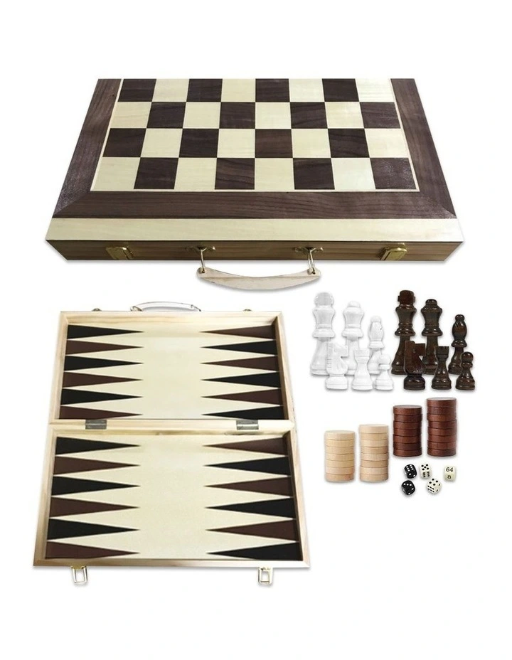 Folding 3 in 1 Large Wooden Games set including Chess, Draughts and Backgammon.