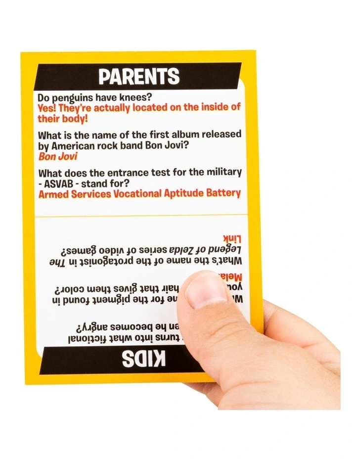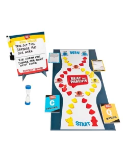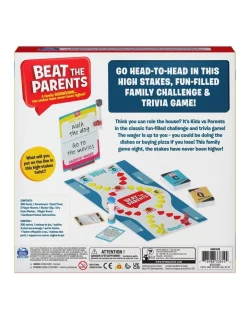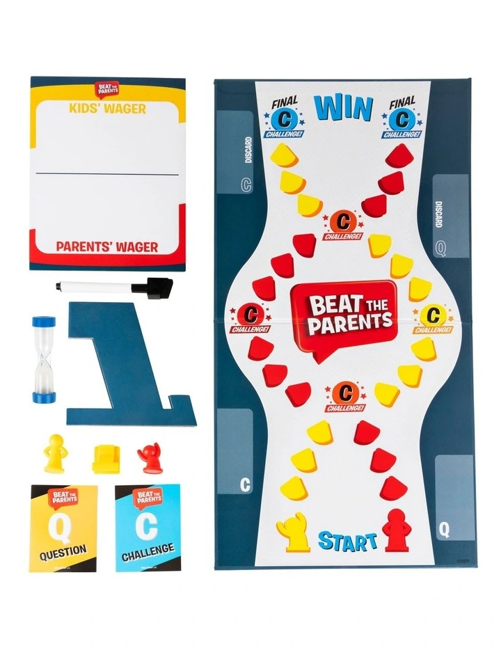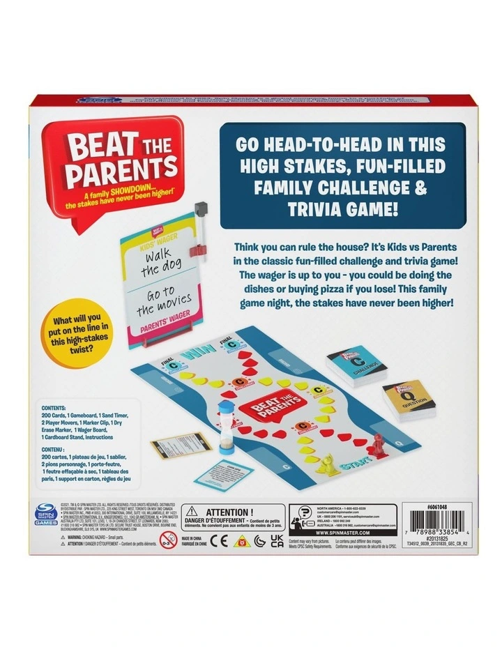 Beat the Parents is the family showdown game where kids compete against their parents for household supremacy! There are more than just bragging rights at stake each team must pick a wager before the game can begin. What are you willing to do if you lose? Wash the dishes? Treat the other side to movie night? Use the dry erase marker and wager board to put the stakes on display, and then start the competition!